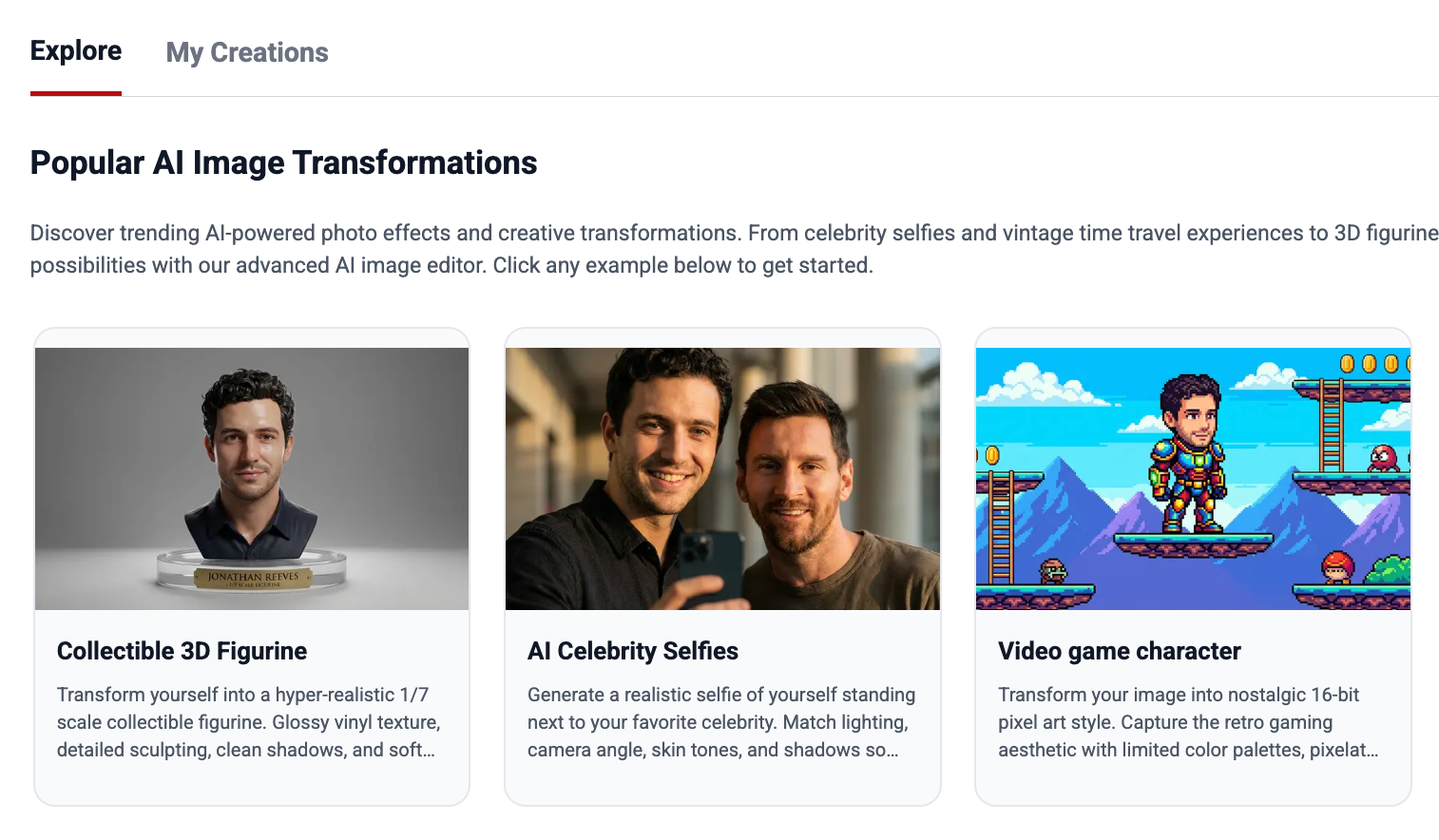 In the Explore tab, you’ll find Popular AI Image Transformations—a curated set of 10+ viral Nano Banana use cases. Each example card includes a ready-made prompt.