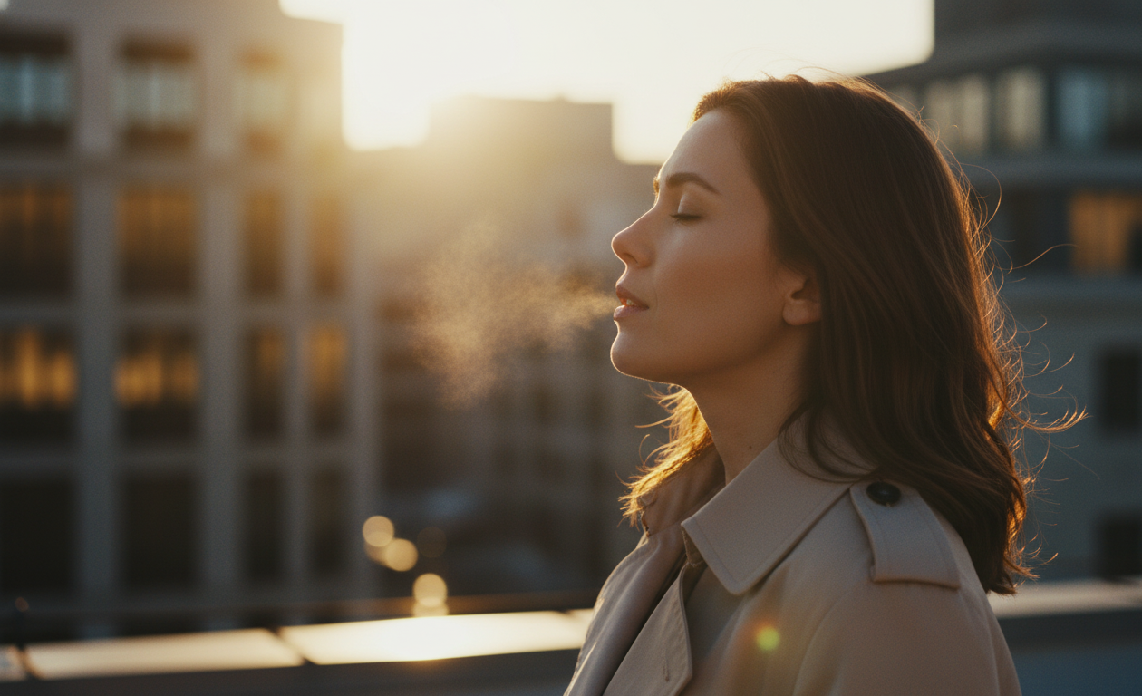 "A woman in her late 20s wearing a beige coat stands on a quiet rooftop at sunset. Warm golden light reflects off nearby buildings. She gently exhales as the wind moves her hair. The camera begins with a wide shot, then slowly dollies into a soft side close-up. Cinematic style with natural colors, soft film grain, and high-dynamic-range lighting. Smooth motion, minimal background distractions."