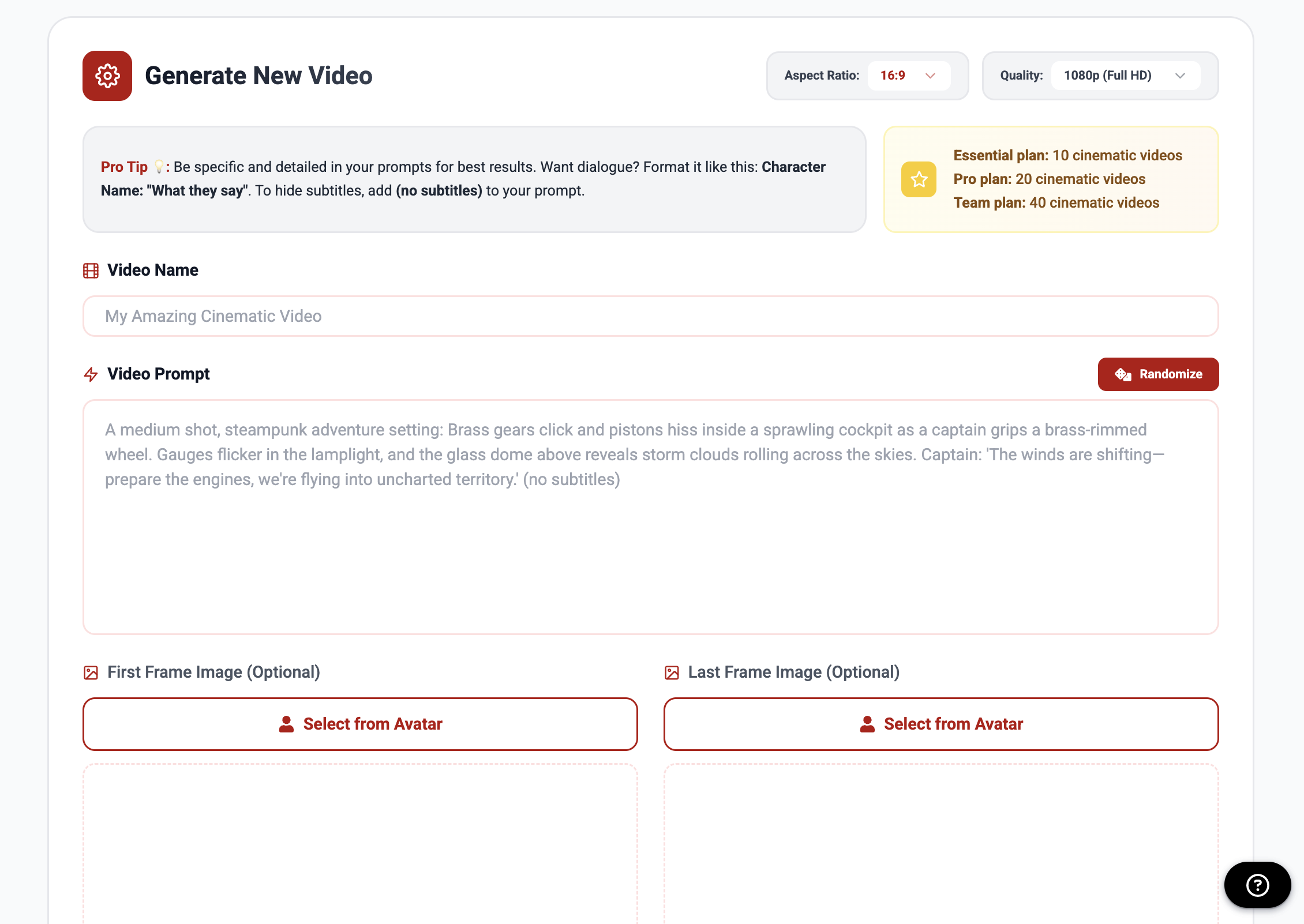 Generate videos directly in your browser without installing software. You can choose aspect ratios (16:9 or 9:16), select video quality (1080p or 720p), upload first/last frame images, or pick from 100+ avatars to guide your scenes.